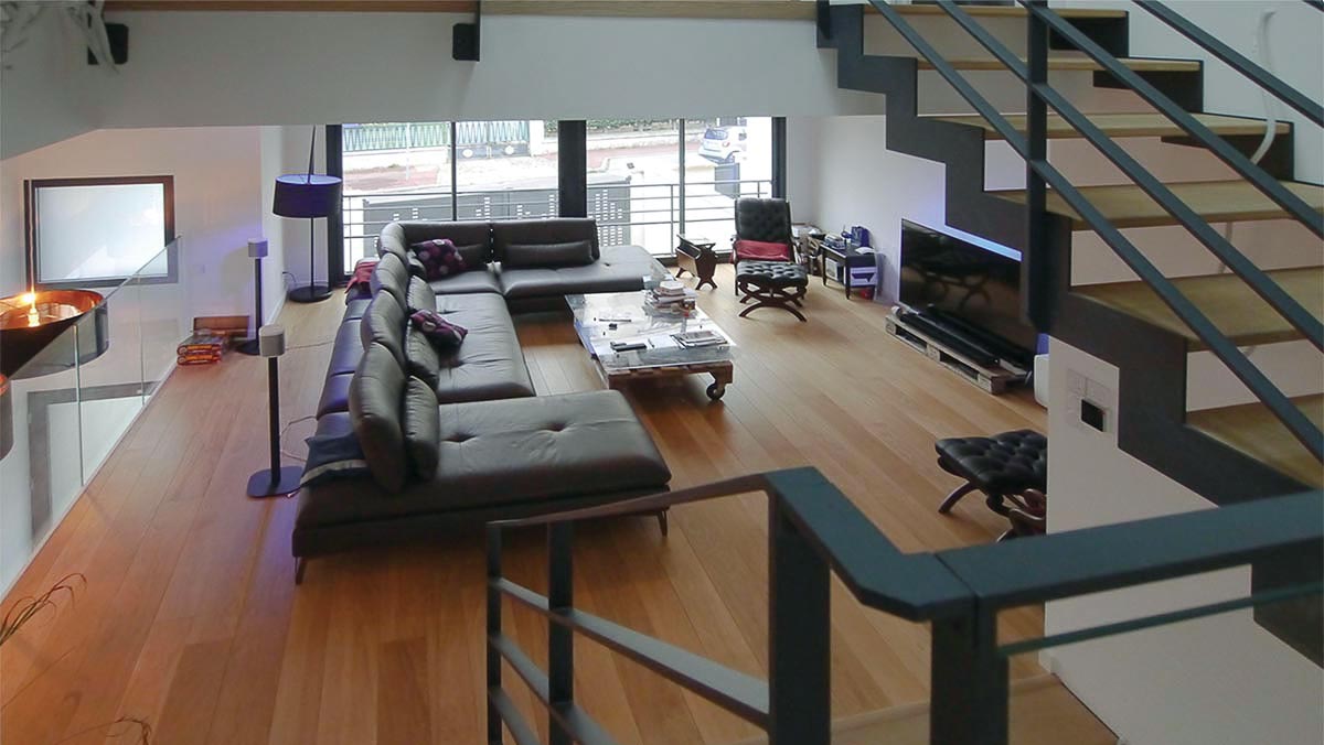 Le Béton ciré, c’est « tendance » et se pose « partout » sauf assurément sur des supports dégradés. Les clients ont choisi un beau gris bleuté suffisamment neutre pour épouser les couleurs marine et les formes du navire : la superbe cuisine sur mesure aux tons forts et très brillants. Cette grande pièce à vivre, salle commune ancestrale et très moderne, où l’on mange « aux fourneaux » avant d’aller se détendre au salon de jardin, l’été, ou au niveau supérieur. Tout un art de vivre, avec des équipements haut de gamme à la hauteur.
