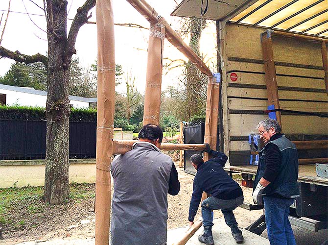 Les baies offrent une vue panoramique sur le parc paysager. Impressionnantes, des ouvertures «totales» sont réalisées en trois panneaux dont un à double galandage, les menuiseries étant, le cas échéant, complètement escamotées «dans» les murs. Ci-dessous, livraison de ces menuiseries... Elles sont effectivement réalisées pour de grandes ouvertures et nécessitent des moyens spéciaux (humains et matériels) pour leur livraison.