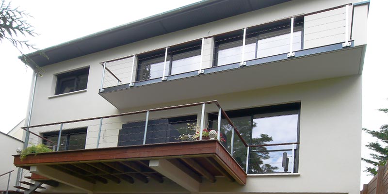Le garde-corps du balcon est fixé sur cette rive ourlée. La pose à l’anglaise très design (fixation en rive sur platine verticale) de ce garde-corps laisse le sol du balcon vierge de tout accessoire et (poteau, platine) libère visuellement de la surface.